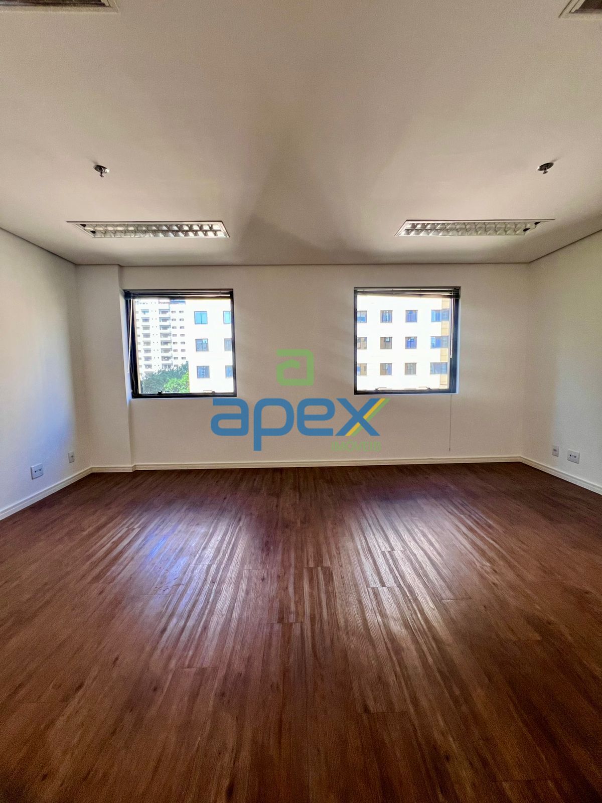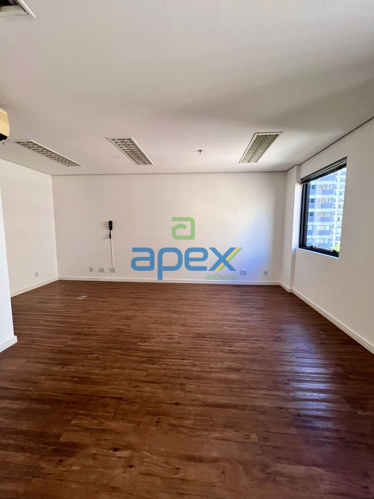 Conjunto comercial recém reformado, com ar condicionado, iluminação, piso vinílico, dois banheiros, vista para o empreendimento Times Square, face leste (sol da manhã) em andar alto e uma vaga de estacionamento.